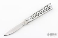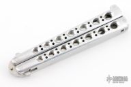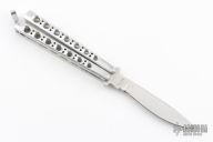 This early balisong from Pacific Cutlery features a Jody Samson ground satin finished blade. The handles are aluminum with hole pattern. There is a heavy gouge on the lock bar. Has scuffs/scratches throughout, has been used, otherwise good user condition.