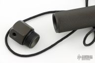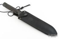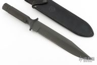 This Jereboam MK II from Chris Reeve is similar to the Shadow series and was made for special forces use. The entire knife was made from a single solid billet of steel. Black coated blade with false top edge. .265" Blade Stock 1.407" Blade Depth. Comes with original black leather sheath. Hardness at between 55 and 57 Rockwell C is not brittle but gives good edge retention along with ease of sharpening. Removable butt cap with storage area in handle. A very nice tactical fixed blade. Has a couple light scuffs, and a couple small oxidation spots on the spine of the blade, otherwise excellent condition. Made in South Africa and is #21.