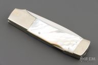 This lockback automatic by John Hoskins features a mirror polished blade, dovetailed nickel silver bolsters, liners, button and butt, mother of pearl scales, mirror polished stainless steel lockbar and backspacer. Has a few light scratches, and some patina. Great condition otherwise.
