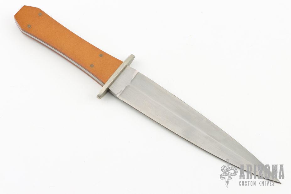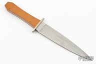 This Arkansas Toothpick by Jimmy Lile features a hand rub satin finished double edged blade, .184" blade stock and 1.126" blade depth, full tapered tang construction. The handle has a nickel silver double guard, yellow paper micarta scales and nickel silver pins. The handle has been scrimshawed. Excellent condition.