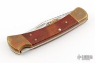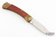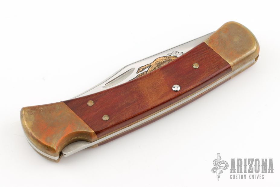 This vintage (1981-1986) Buck 110 "folding hunter" features a satin finished clip point blade with nail nick. It has wood scales, brass bolsters and frame. Limited edition version. Has some patina and some light scuffs, good condition otherwise.