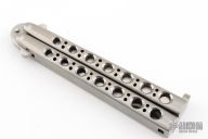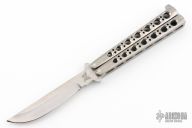 This early balisong from Pacific Cutlery features a Jody Samson ground satin finished upswept utility blade. The handles are integral stainless steel with hole pattern, has t-latch. Has light scratches, excellent condition otherwise.