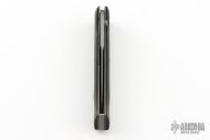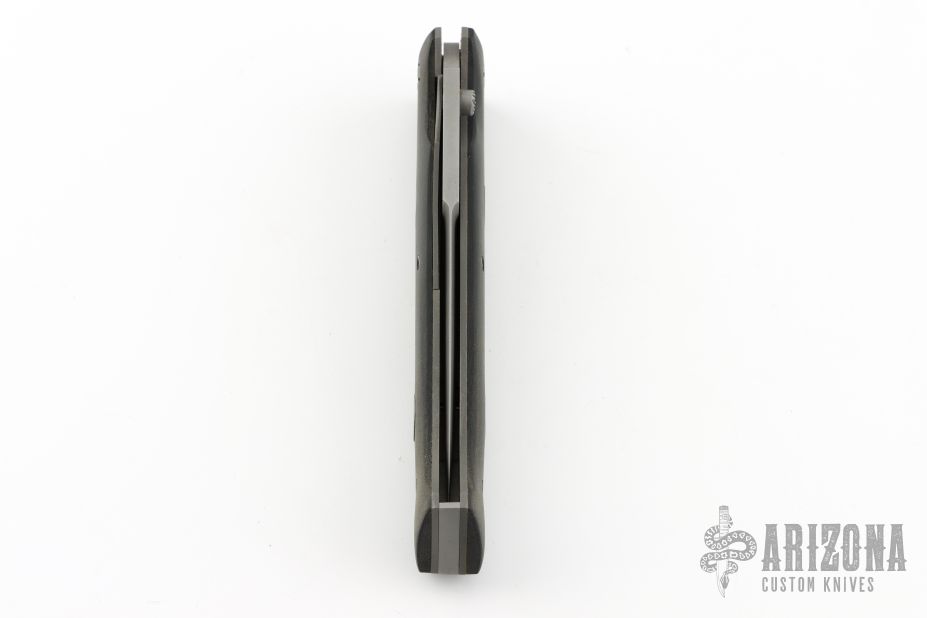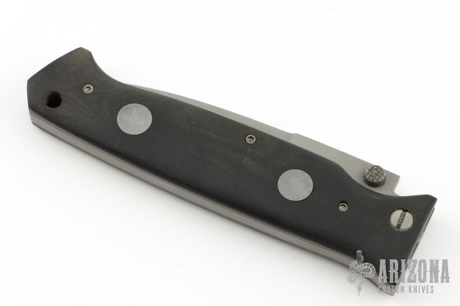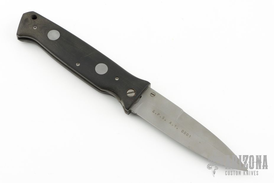 This Linerlock by Butch Vallotton features a bead blasted spear point blade with false top edge. The blade reads "G.P.S. A.1. 0001". The handle has black linen micarta scales over bead blasted titanium liners, steel backspacer and hardware. Has some scuffs, the spring has been removed, and this knife is no longer an auto, otherwise good condition.