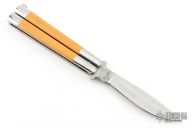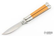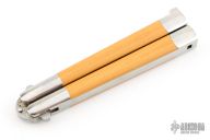 This early balisong from Pacific Cutlery features a Jody Samson ground satin finished blade. The handles are stainless steel with dovetail yellow paper micarta inlays, has t-latch. Has some light scratches otherwise the knife is in excellent condition.