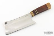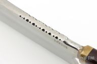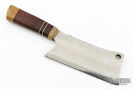 This early Cleaver by Jody Samson features a satin finished blade with fileworked spine, .357" blade stock and 2.803" blade depth, hidden tang construction. The handle has brass guard and butt with a brown canvas micarta grip with brass/black spacers. Has a little patina and some light scratches, otherwise excellent condition.