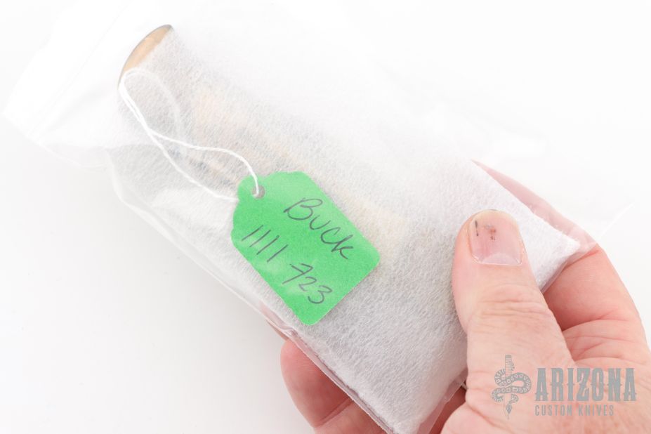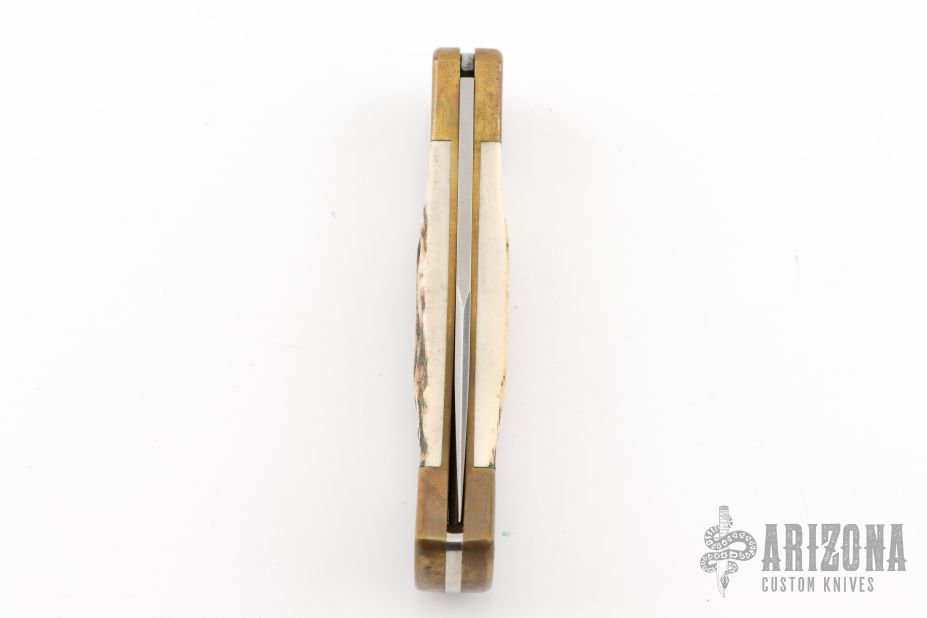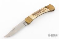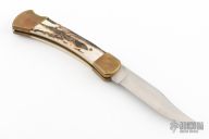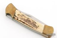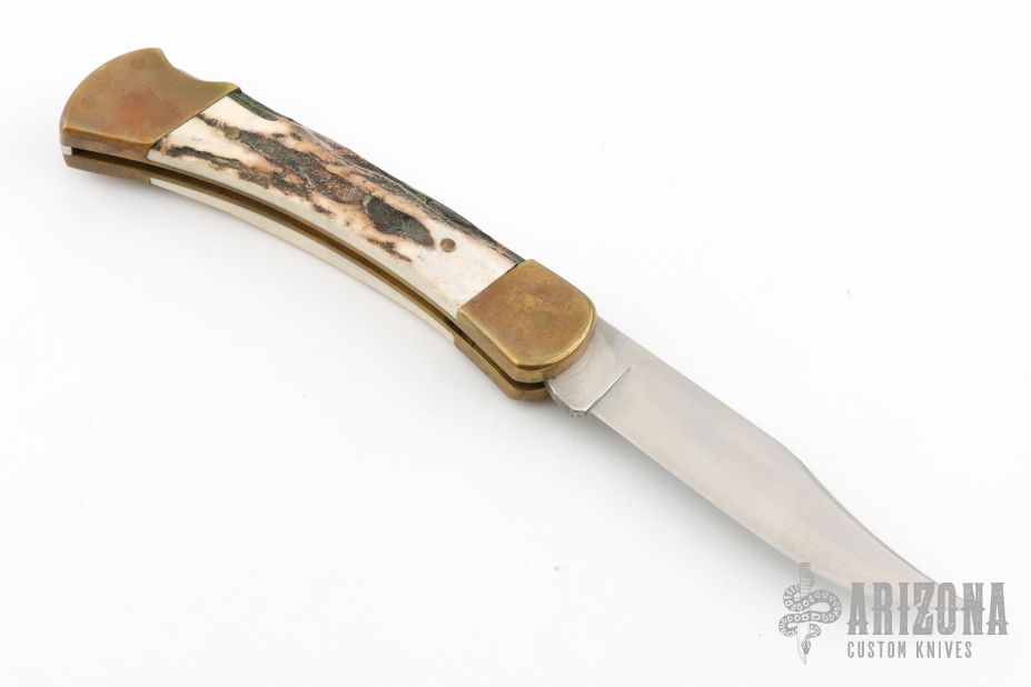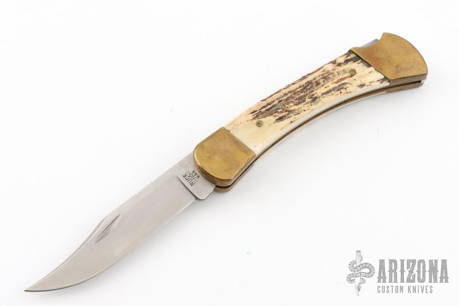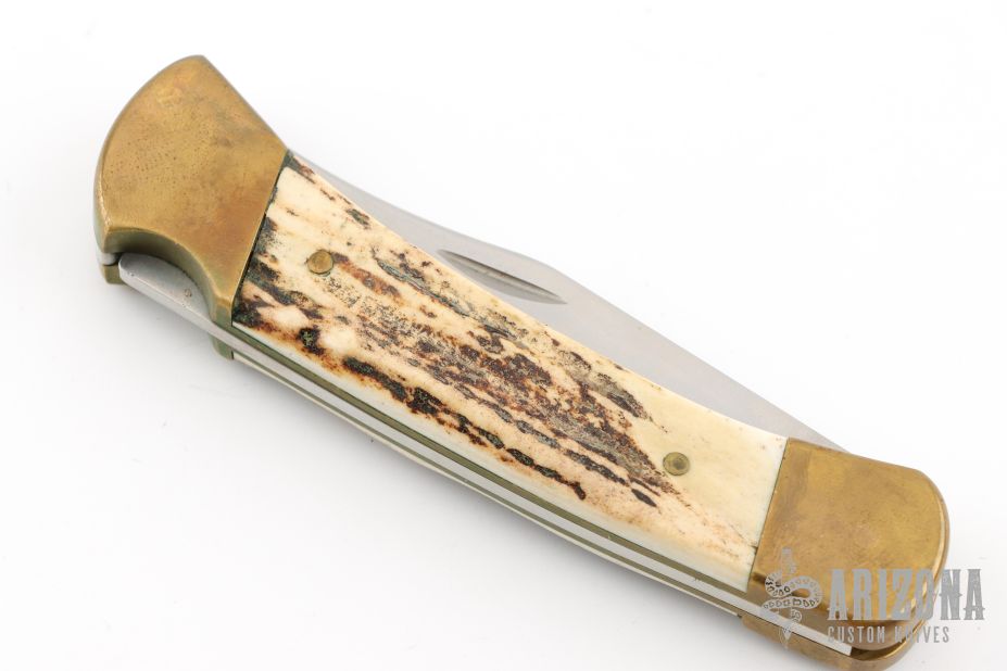 This vintage Model 110 (1981-1986) by Buck features a satin finished clip point blade with nail nick. The handle has a brass frame with stag scales. Has scuffs, scratches, and patina. Great condition for its age.