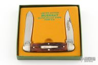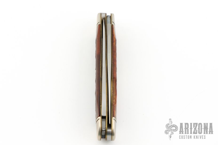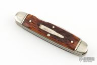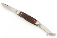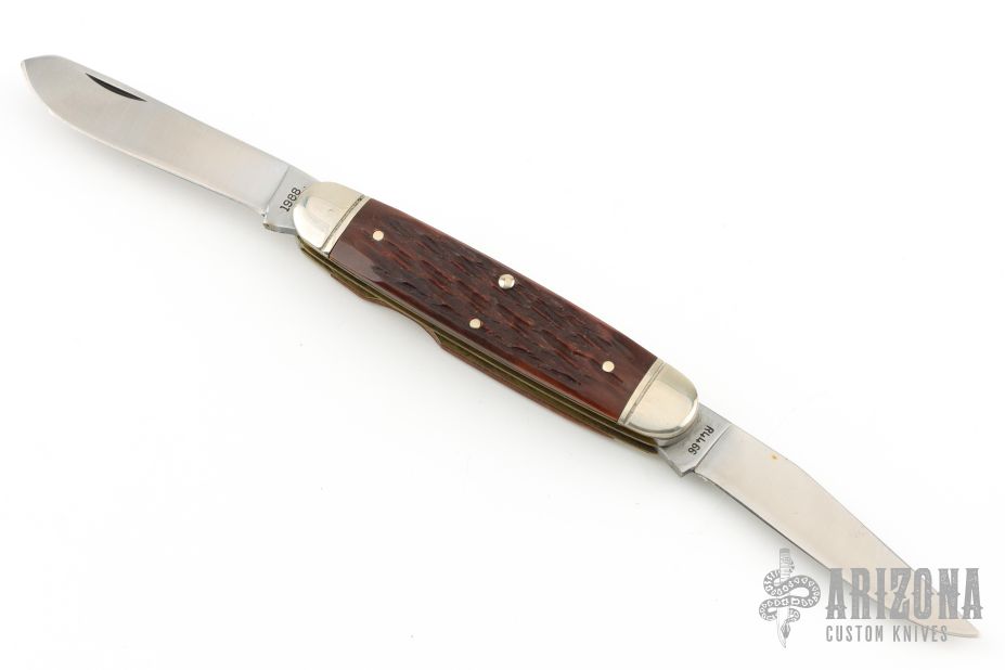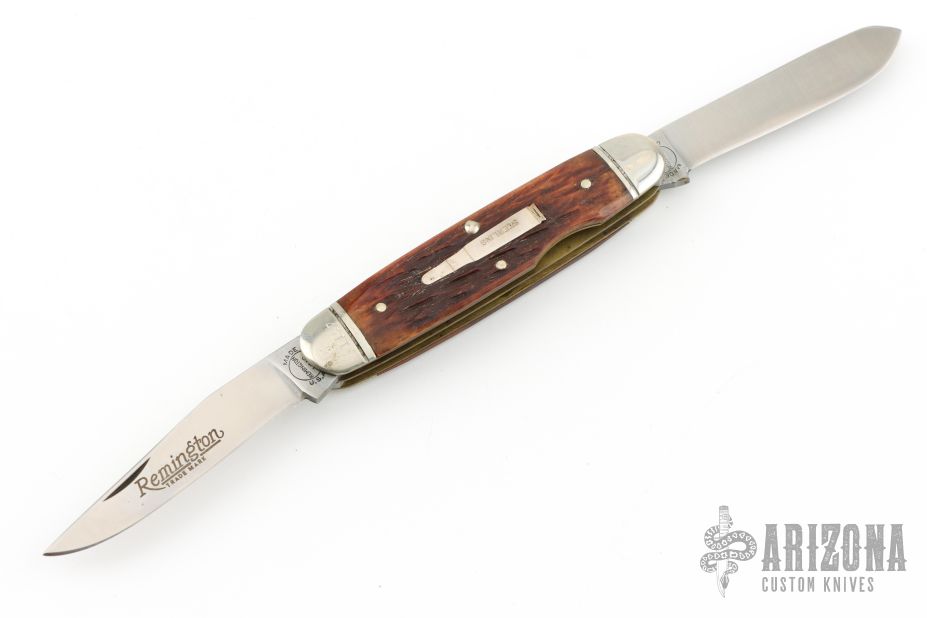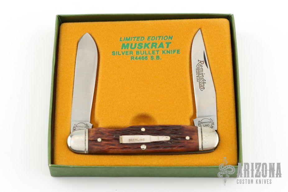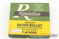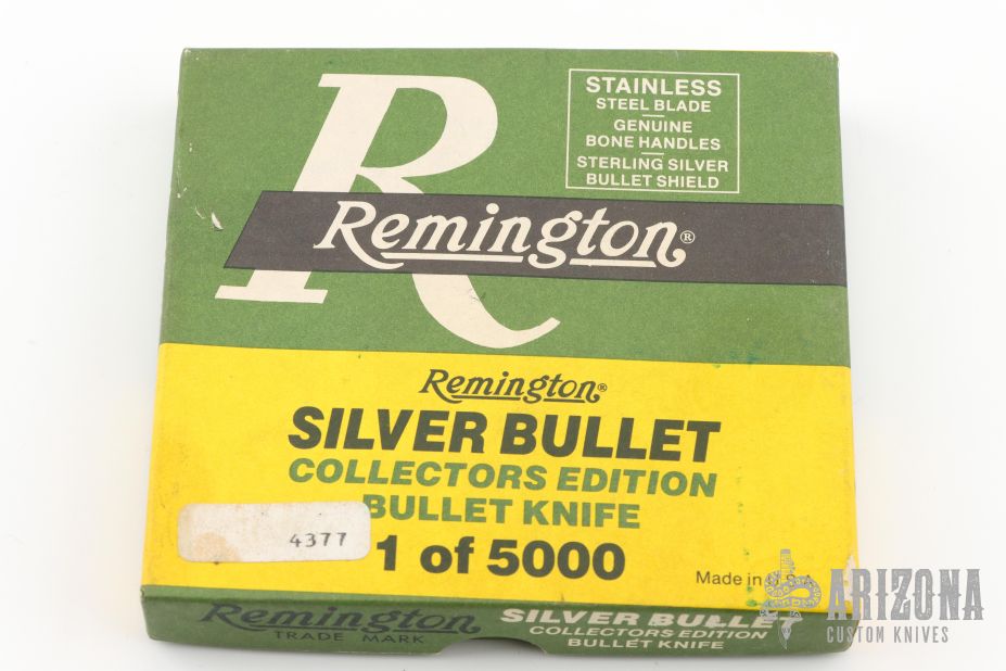 This Knife by Remmington has two satin finished blades with nail nicks. The handle has nickel silver bolsters, jigged bone covers with a sterling silver bullet escutcheon, brass liners and steel springs.  Comes with original box. Excellent condition. Dated 1988 and #4377 of 5000