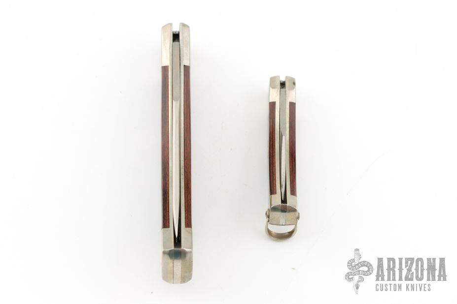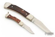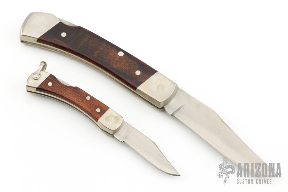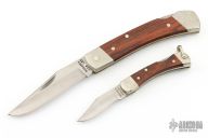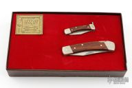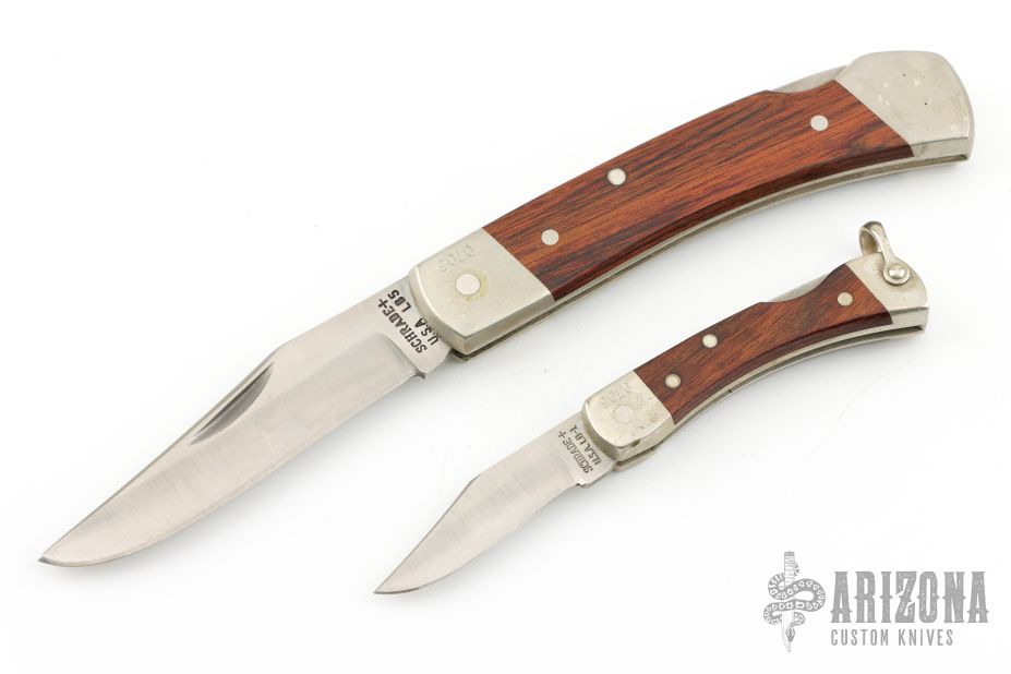This two knife set by Schrade Cutlery features satin finished blades with nail nicks. The handles have nickel silver bolsters with integral liners, wood scales, stainless steel backspacer. Comes with original box, papers and a black leather sheath for the larger knife. Has some patina, otherwise excellent condition. #0703 on the bolsters.