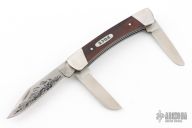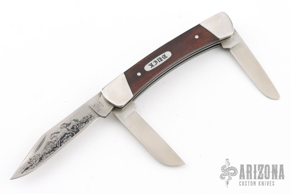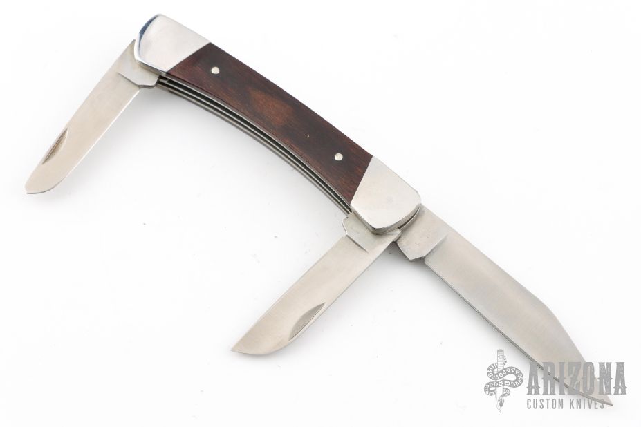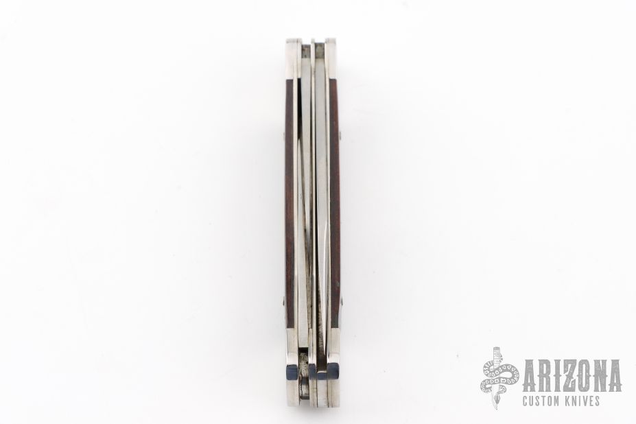 This Model 701 by Buck features a satin finished blades with nail nicks. The handle has stainless steel bolsters and liners, wood covers with stainless steel springs. Comes with original box. Excellent condition.
