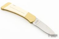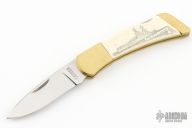 This Gerber Lockback features a polished drop point blade with nail nick. The handle is brass with scrimshaw covers and stainless rockerbar. Comes with original wooden display case with brass medallion. Has a couple light scuffs, excellent condition otherwise.