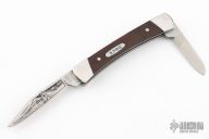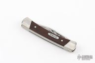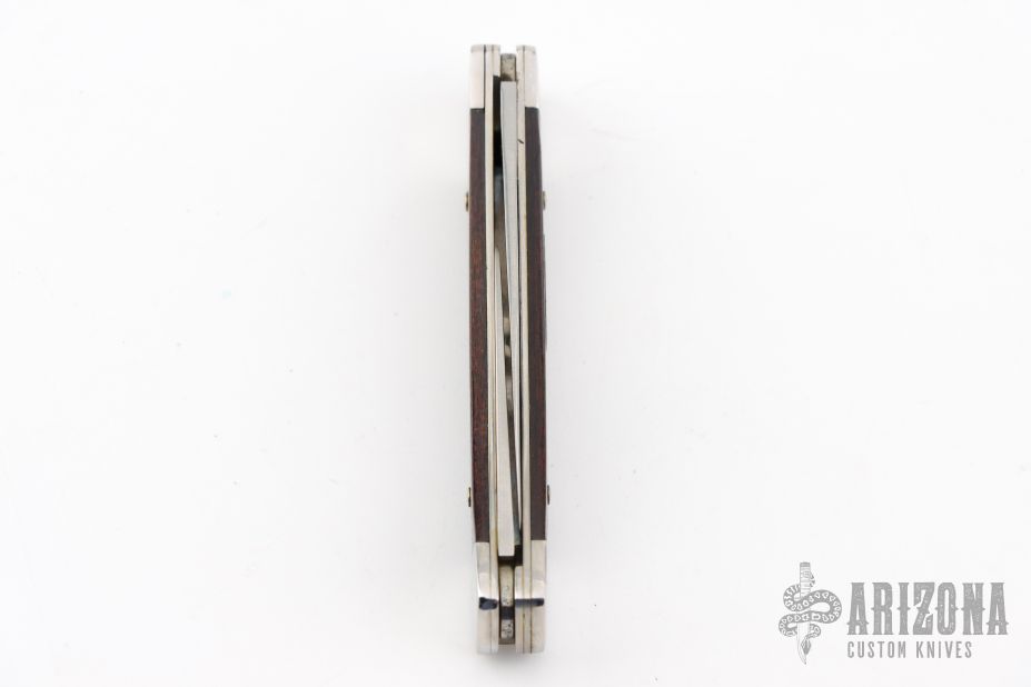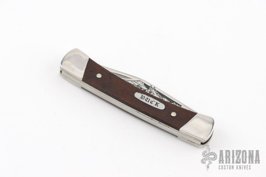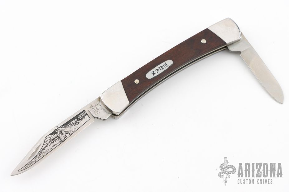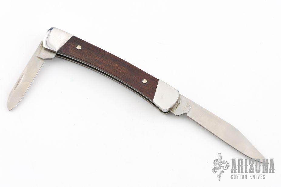 This Model 709 by Buck features a satin finished blades with nail nicks. The handle has stainless steel bolsters and liners, wood covers with stainless steel springs. Comes with original box. Excellent condition.
