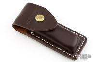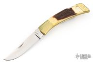 This knife features a satin finished blade with nail nick. The handle has a brass frame with stag scales. Comes with original box and brown leather sheath. Has some patina, otherwise excellent condition.