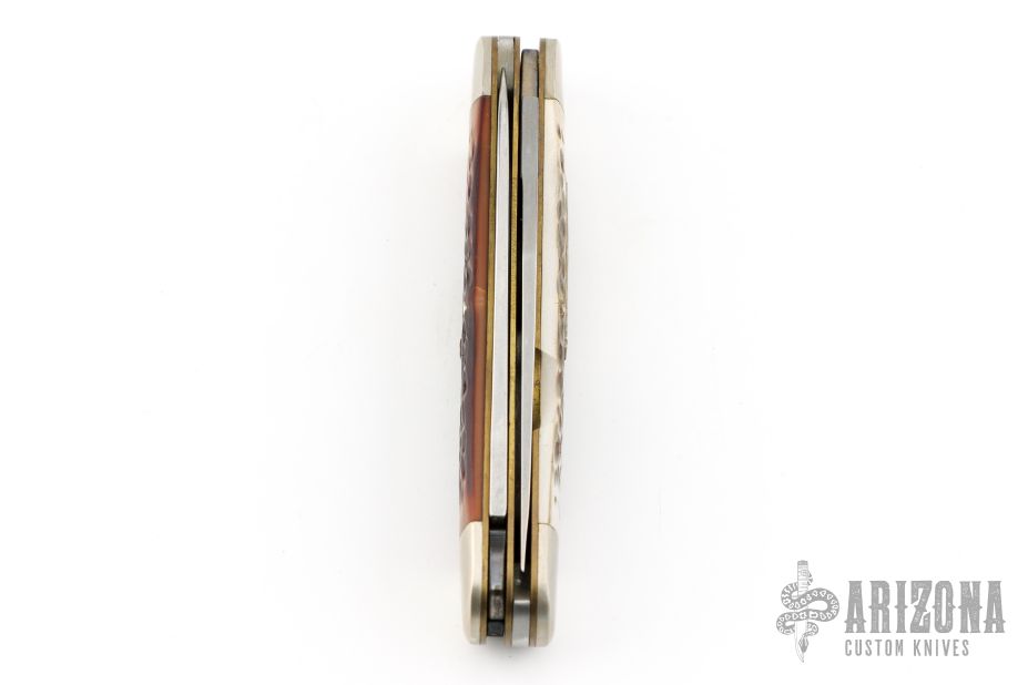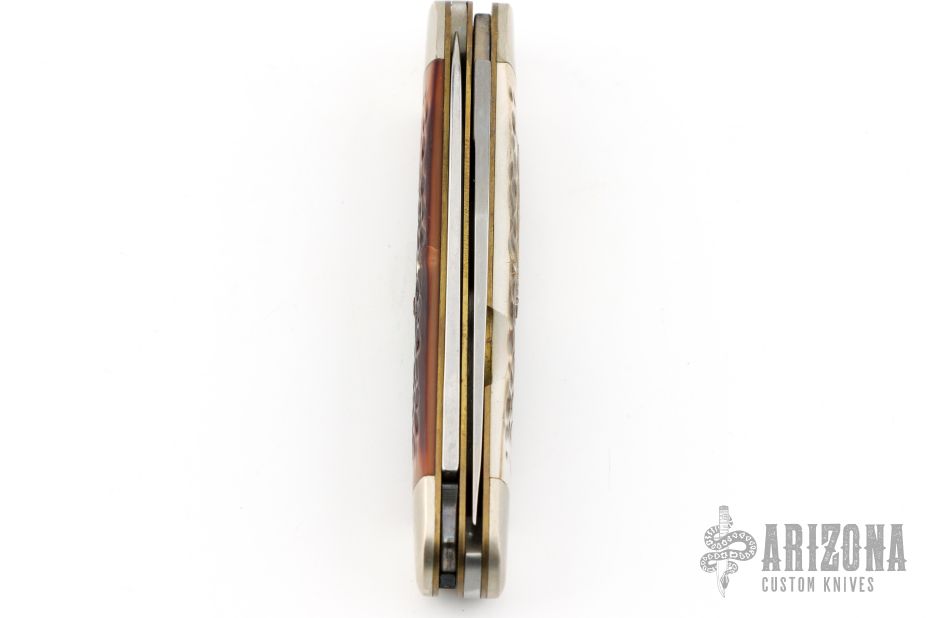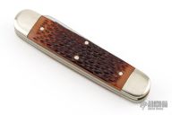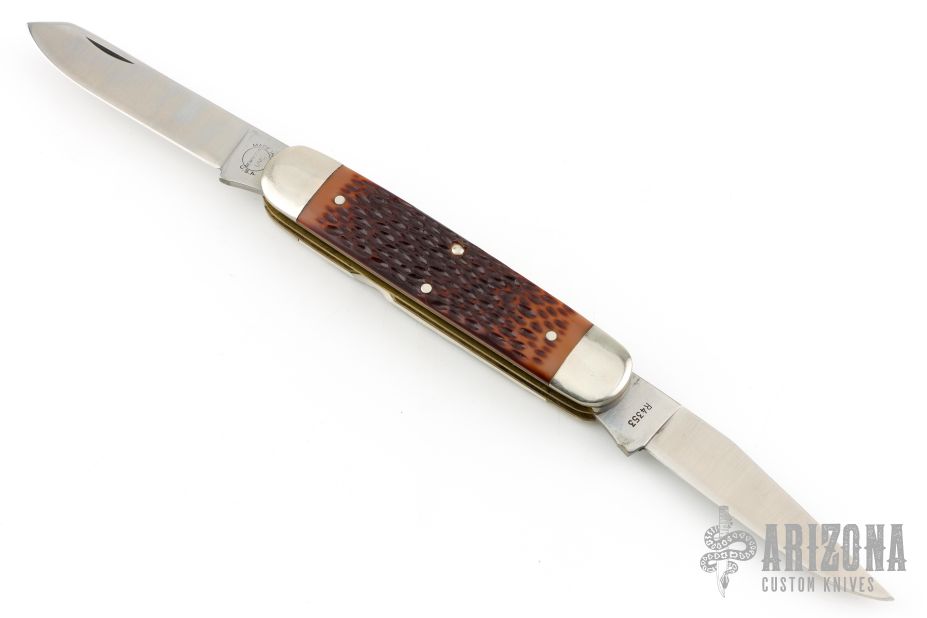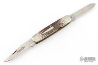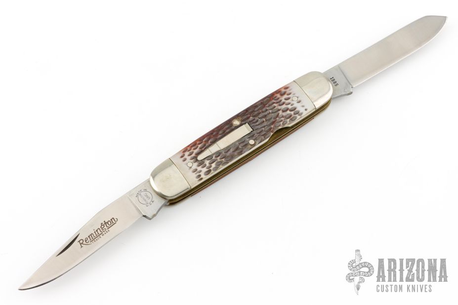 This "Woodsman" bullet knife was the Remington Collector's Series Knife for 1985. Muskrat style. Has satin finished blades with nail nicks. The handle has nickel silver bolsters, faux jigged bone covers, brass liners and stainless steel springs. Comes with original box and papers. Excellent condition.