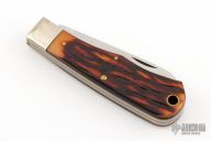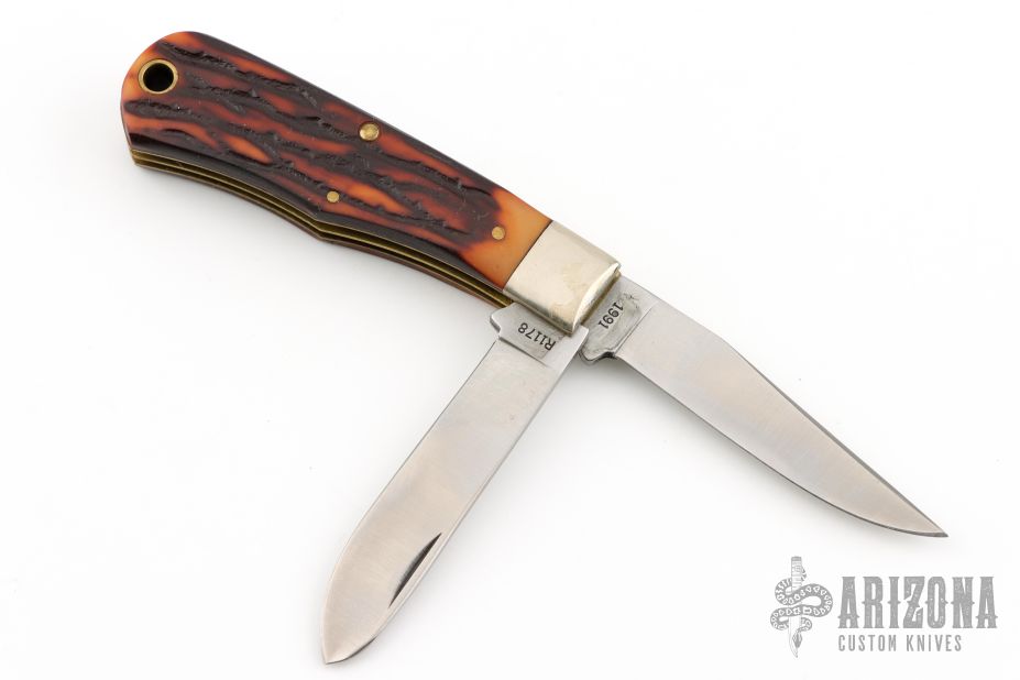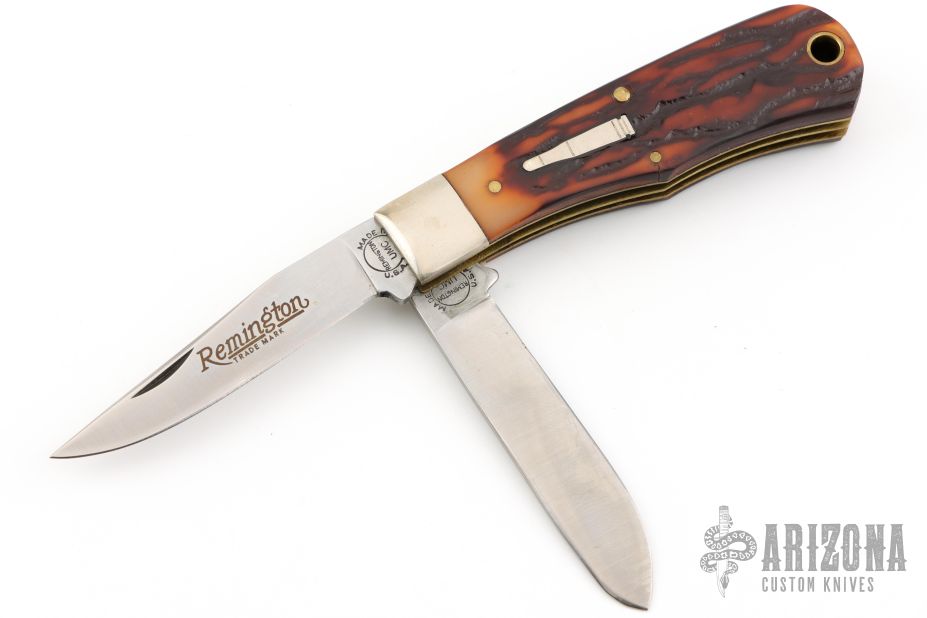 This Bullet Knife by Remmington has two satin finished blades with nail nicks. The handle has nickel silver bolsters, stag covers, brass liners and steel springs. Includes the original box and papers. Excellent Condition.