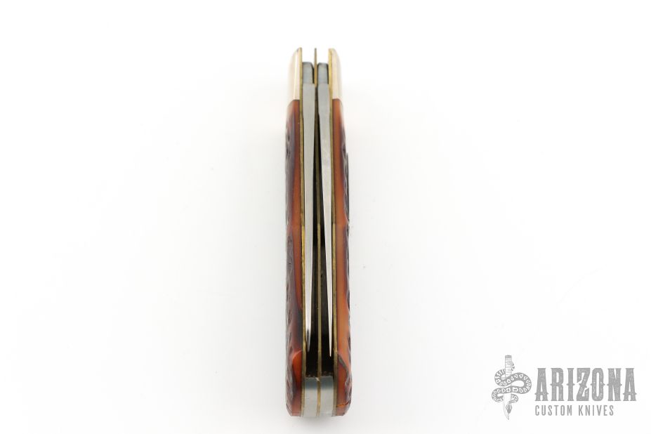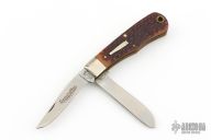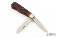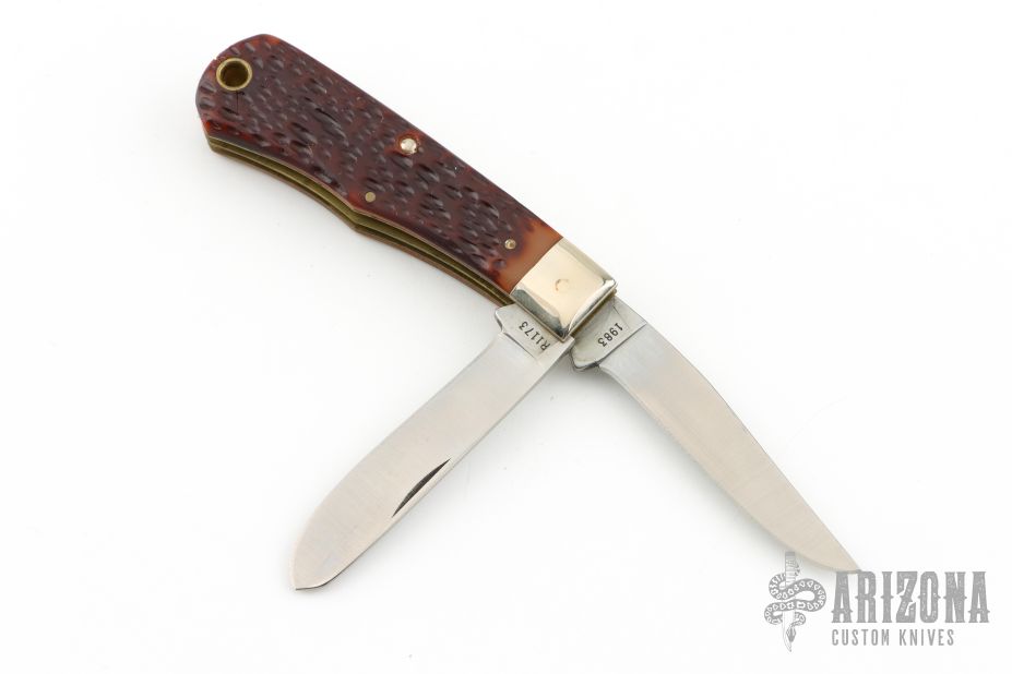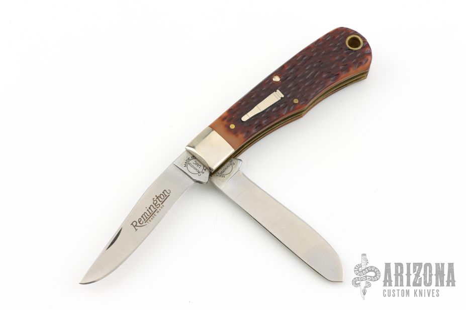 This Bullet Knife by Remmington has two satin finished blades with nail nicks. The handle has nickel silver bolsters, jigged bone covers, brass liners and steel springs. Excellent Condition. Comes with original box.