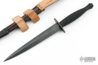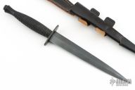 This Fairbairn Sykes is stamped "NATO No 4658827" and "1976 Sheffield England" on the guard. It features a double-edged blued blade, .195" blade stock and .936" blade depth, hidden tang construction. The handle has a black steel guard and a black ribbed handle. Comes with a black leather sheath. Has some minor wear on the finish, excellent condition otherwise.