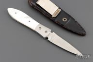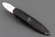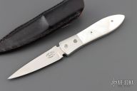 This knife by Jason Jacks features a hand rub satin finished blade with false top edge, .121" blade stock and .785" blade depth, full tang construction. The handle has Damascus bolsters, mother of pearl scales, fileworked tang. Comes with a black leather boot sheath. Has a couple light scratches, otherwise excellent condition.