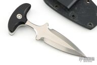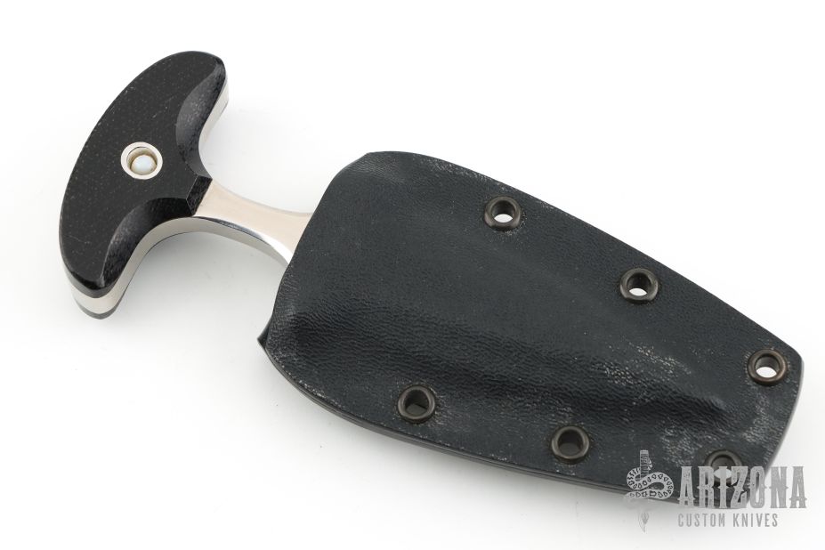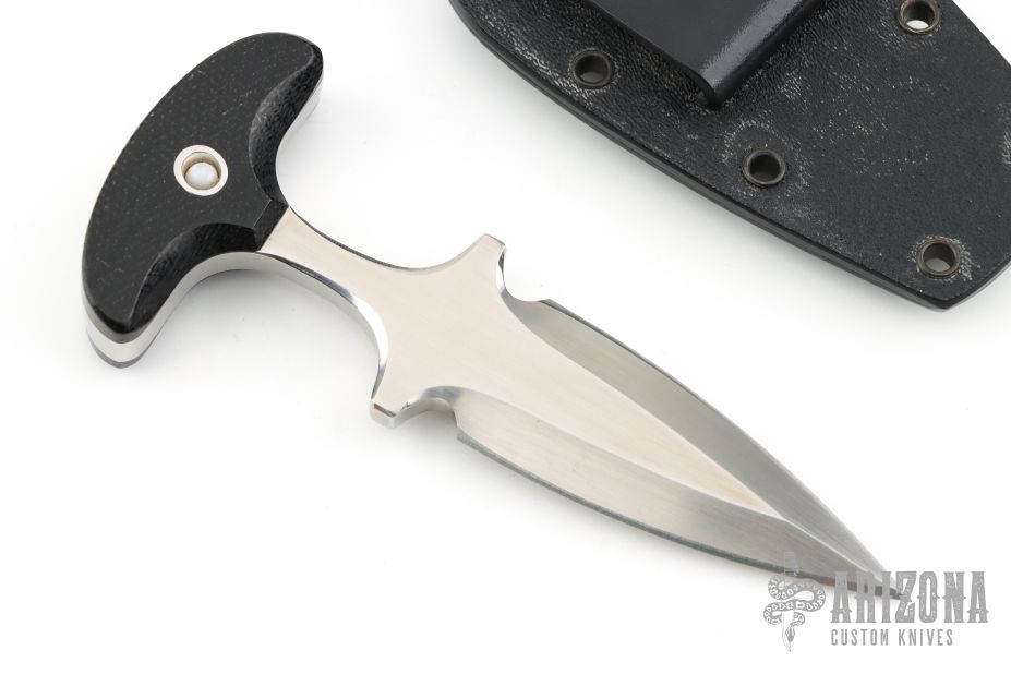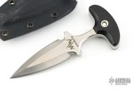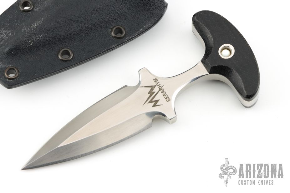 This MercWorx Seraphym Push Dagger features a 3" blade. .250" stock and 1" blade depth, full tang construction. The 2" wide micarta handle is designed for an ergonomically positive grip, the pin has mother of pearl inlays. A solid, firm push dagger. Includes kydex sheath. Has a few light scratches, otherwise excellent condition.