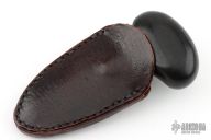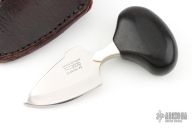 This knife by James Rehrer features a mirror polished blade with .200" blade stock and 1.501" blade depth, full tang construction. The handle has mother of pearl bolsters, dark wood grip. Comes with a brown leather boot sheath. Has a few light scratches, otherwise excellent condition.