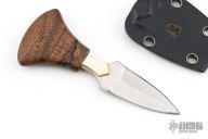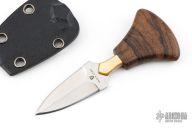 This knife by Browning has been given a custom handle. It features a satin finished double edged blade with .134" blade stock and .901" blade depth, full tang construction. The handle has gold lip pearl bolsters, dark wood grip. Comes with a kydex sheath. Has a few light scratches, otherwise excellent condition.