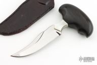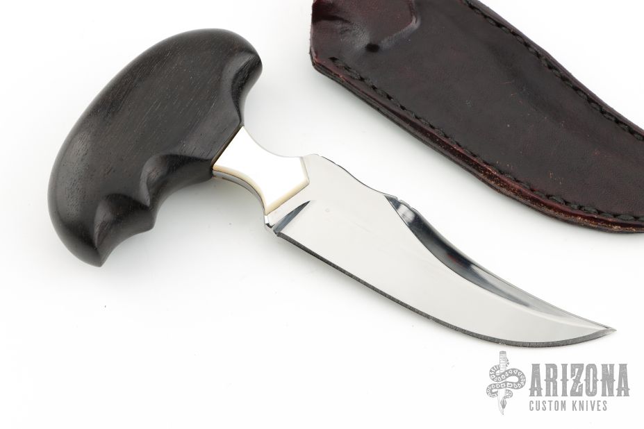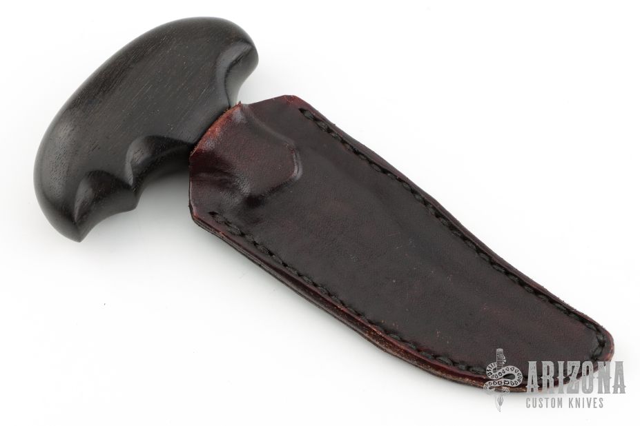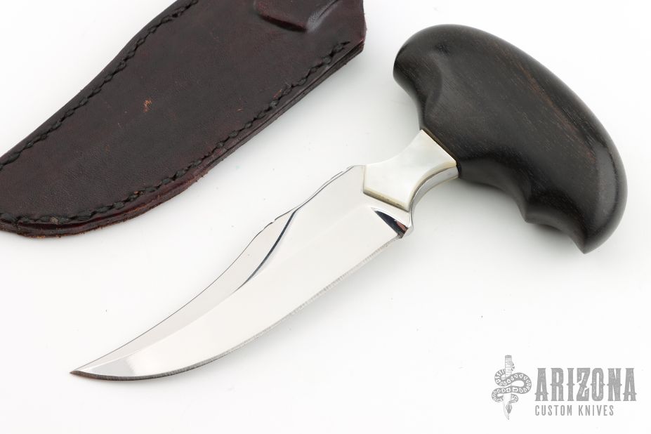 This Push Dagger has a mirror finished blade with false top edge, fileworked spine, hidden tang, .218" blade stock, 1.043" depth. The handle has mother of pearl bolsters, dark wood grip. Has some light scratches, excellent condition otherwise. Comes with brown leather sheath.