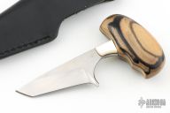 This Push Dagger has a hand rub satin finished tanto blade with hidden tang, .159" blade stock, 1.389" depth. The handle has mother of pearl bolsters, dark grip. Has some light scratches, excellent condition otherwise. Comes with black leather sheath.