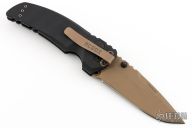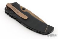 This Hogue/Elishewitz design features a FDE Cerakote blade with dual thumbstuds and notched thumbrest. The handle has milled black G-10 frame with button lock, safety and tip down carry clip. Includes original zippered case. Has some scuffs and scratches, great condition otherwise.