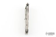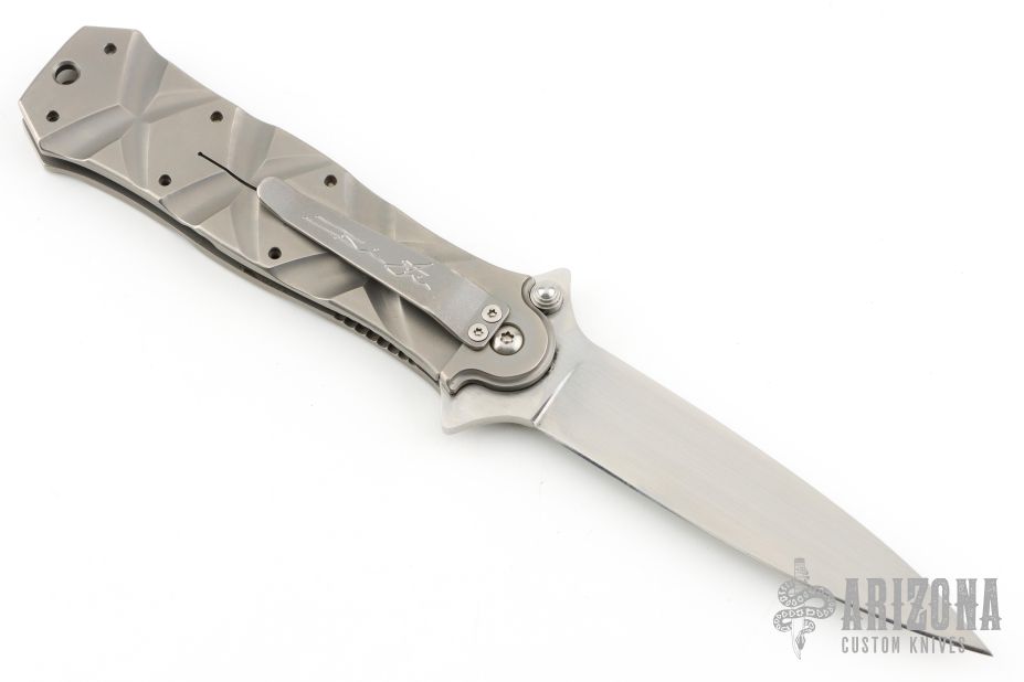 This Tighe Die flipper by Brian Tighe features a hand rub satin finished spear point blade with a false top edge, dual thumb-studs and flipper. The handle has a bead blasted titanium frame with titanium barrel spacers, and tip down titanium clip. Nice detent, lockup and blade seating. Has some light scuffs/scratches, otherwise excellent condition.