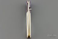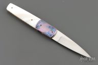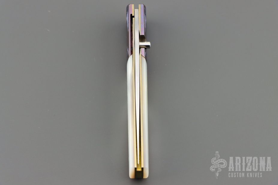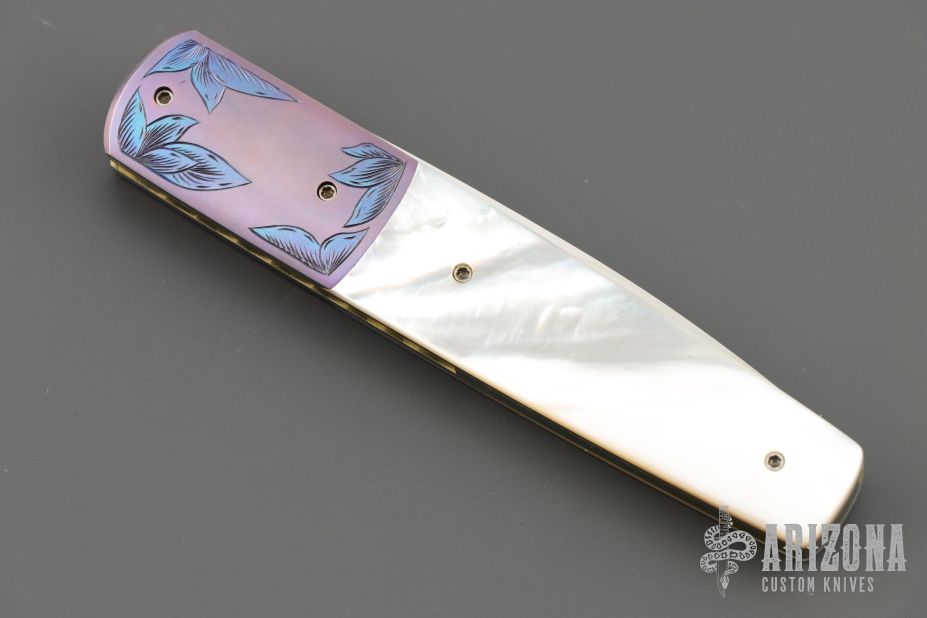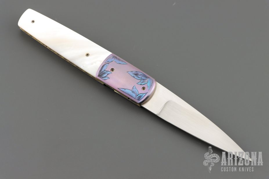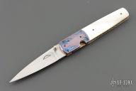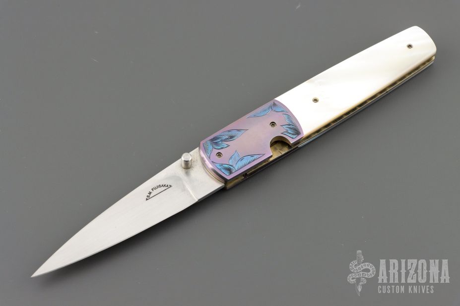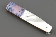 This linerlock folder by Stan Fujisaka features a hand rub satin finished blade with single thumbstud. The handle has engraved and anodized titanium dovetailed bolsters, mother of pearl scales, anodized titanium liners with jeweled interiors, anodized titanium backspacer. Smooth action with a nice detent, lockup and blade seating. Has a couple light scratches, otherwise excellent condition.