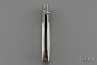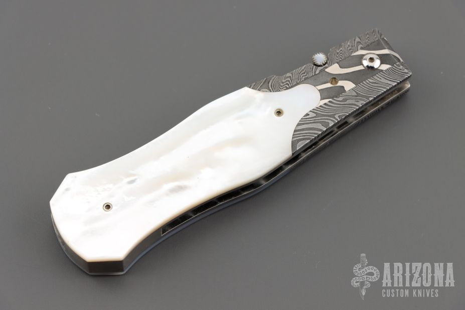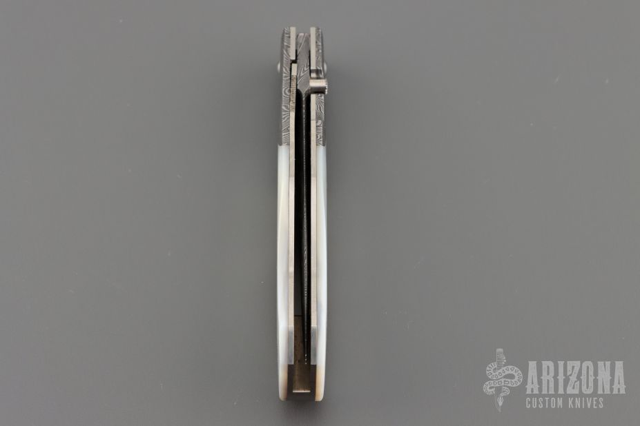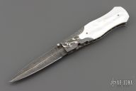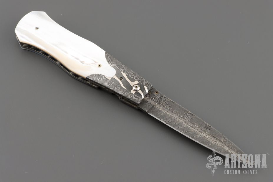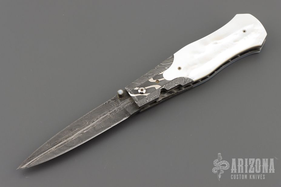 This linerlock Dagger by Brian Tighe features a Damascus dagger blade with false top edge and a single thumbstud with mother of pearl inlay. The handle has Damascus bolsters with presentation grade mother of pearl scales, jeweled titanium liners and backspacer. Has a little lock rock, otherwise excellent condition.