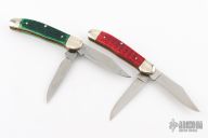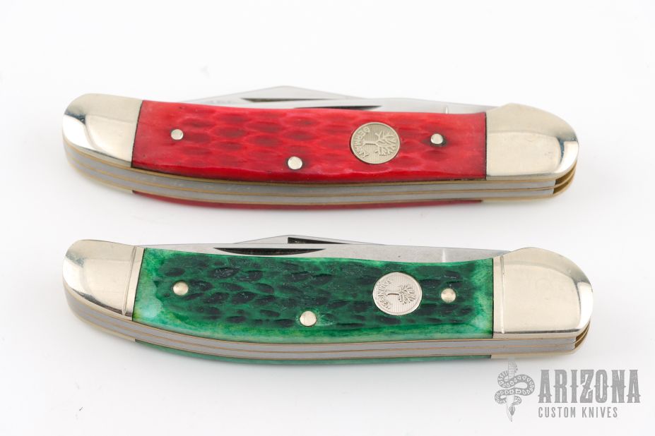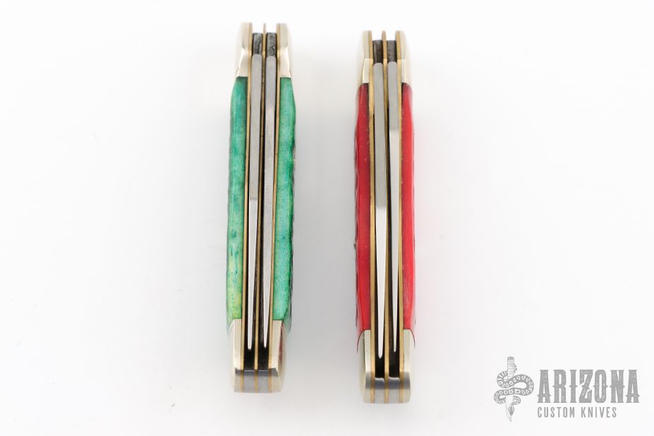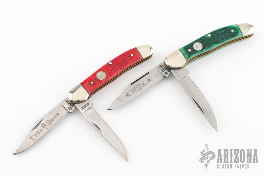 This set includes two, 2-Blade Trappers by Boker. Mirror polished blades, nickel silver bolsters, jigged bone covers, brass liners, stainless steel spring. Has some scuffs and scratches, great condition otherwise.