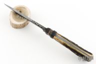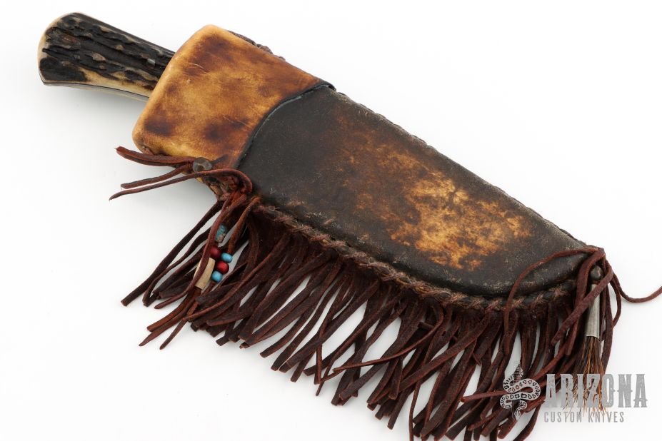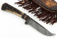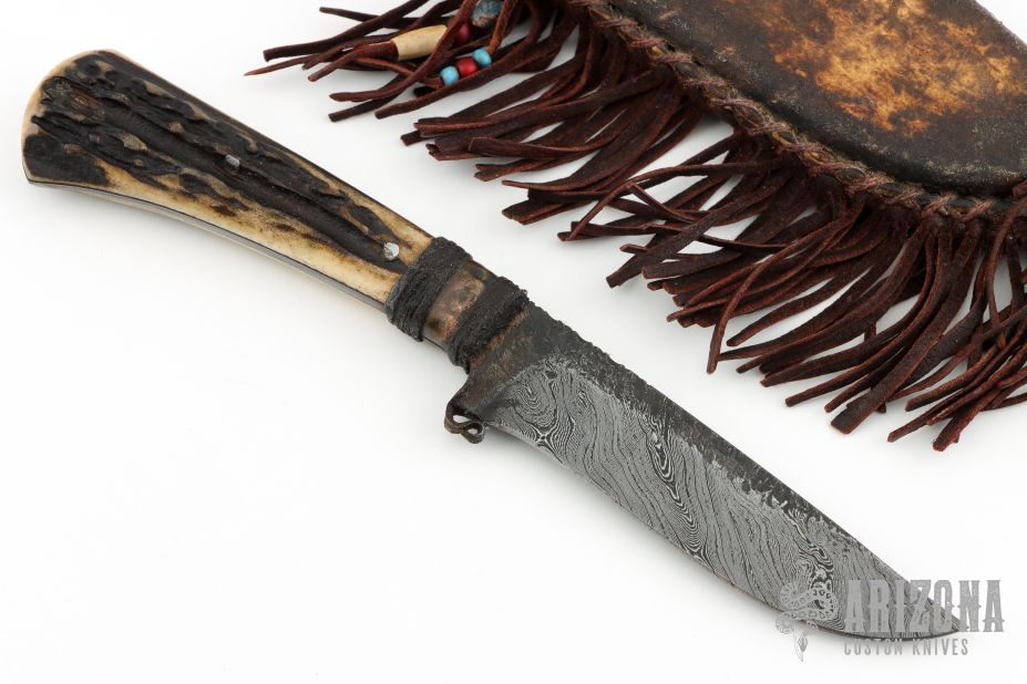 This knife by Master Smith Daniel Winkler features a Damascus drop point blade with a fileworked thumbrest and full tapered tang construction, .188" Blade Stock and .995" Blade Depth. The handle has wrapped leather and copper bolsters with stag scales.  Includes a raw hide covered leather sheath and a zippered case.  Excellent Condition.