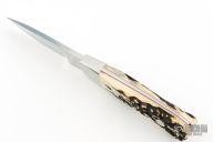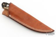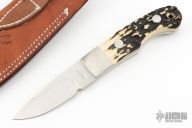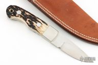 This hunter by Herman Schneider features a hand rubbed satin finish blade with .175" blade stock, 1.103" blade depth, full tapered tang construction. The handle has stainless steel dovetailed bolsters and stag scales with red liners. Great feel in hand. Outstanding work. Comes with a brown leather sheath. Has some light scratches, otherwise excellent condition.