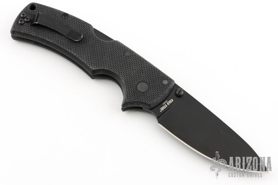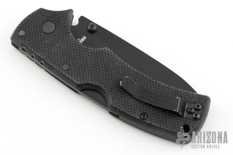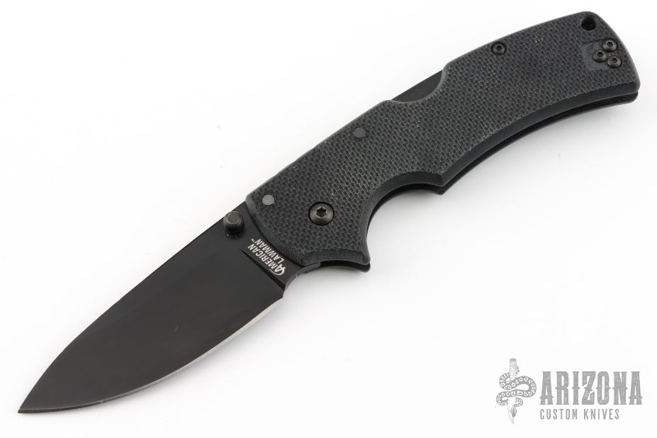 This American Lawman folder form Cold Steel features a black drop point blade with dual thumb studs. The handle has black G-10 scales with a black stainless steel clip, left or right-handed carry. Has some scuffs and scratches, great condition otherwise.