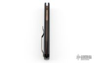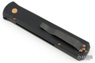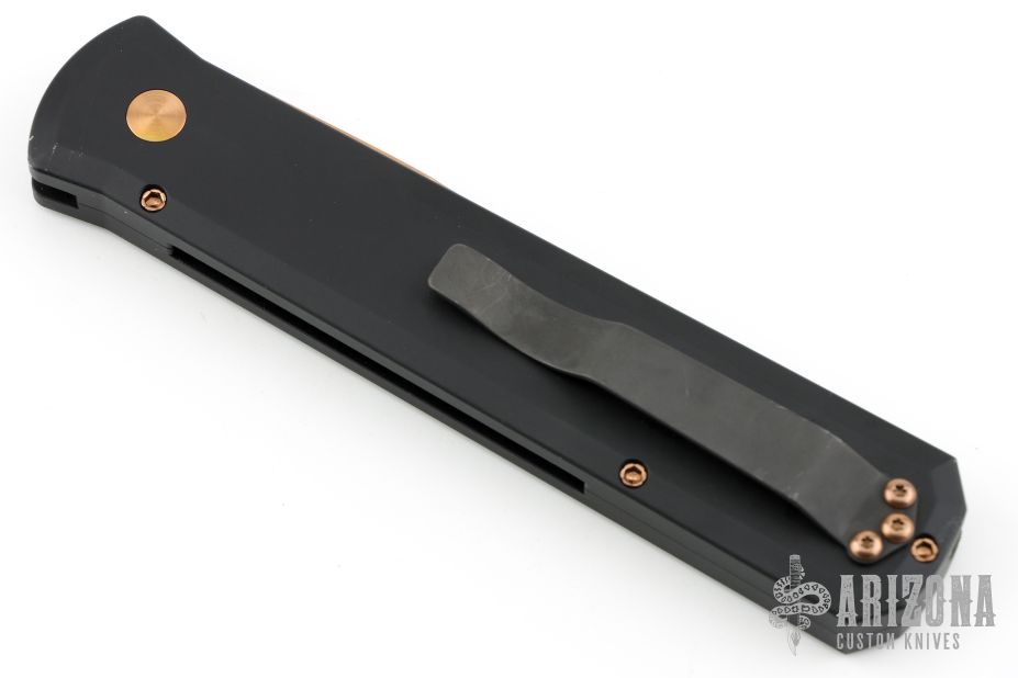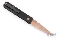This Godfather by Pro-Tech features a satin rose gold finished blade with false top edge. The handle has a black aluminum handle with black tip up stainless steel clip. Comes with original box and papers. Has a couple light scuffs and scratches, excellent condition otherwise.