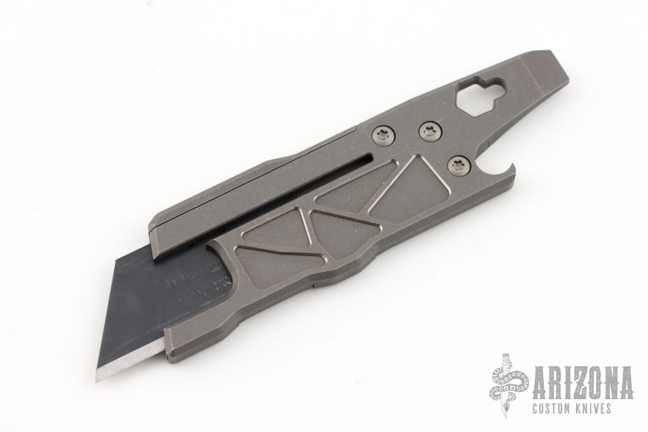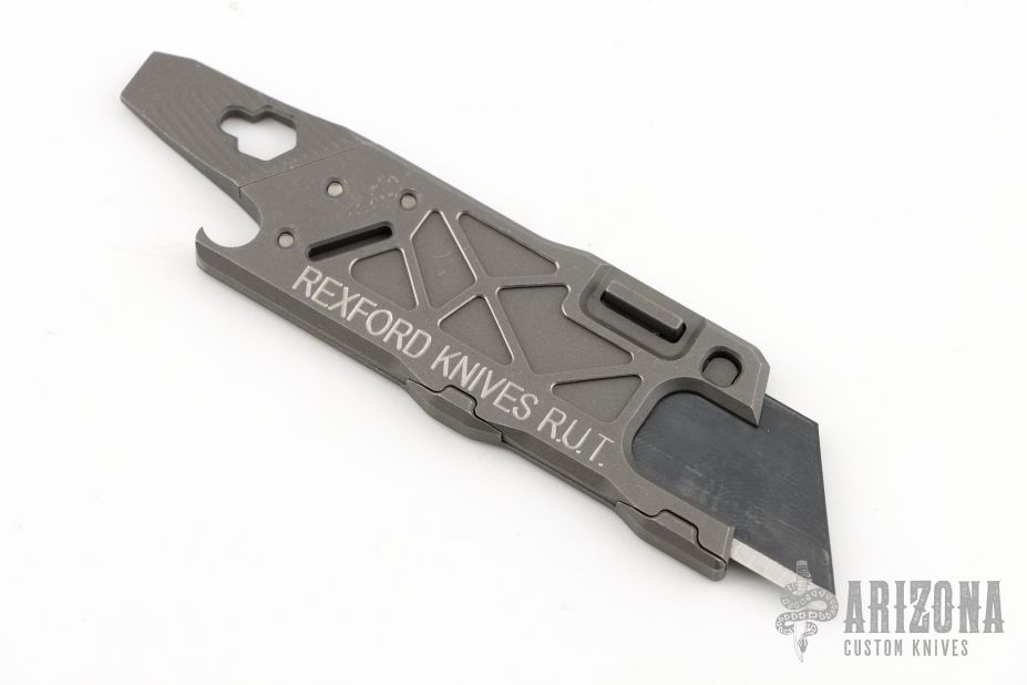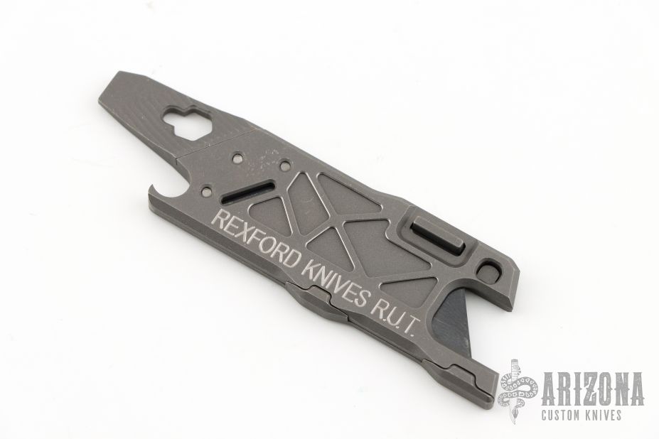 This Rexford RUT (Rexford Utility Tool) from Todd Rexford uses a standard utility razor blade. Blade can easily be replaced. This piece features a functional lanyard hole and flat head screwdriver/pry tip, and bottle opener. New from maker!