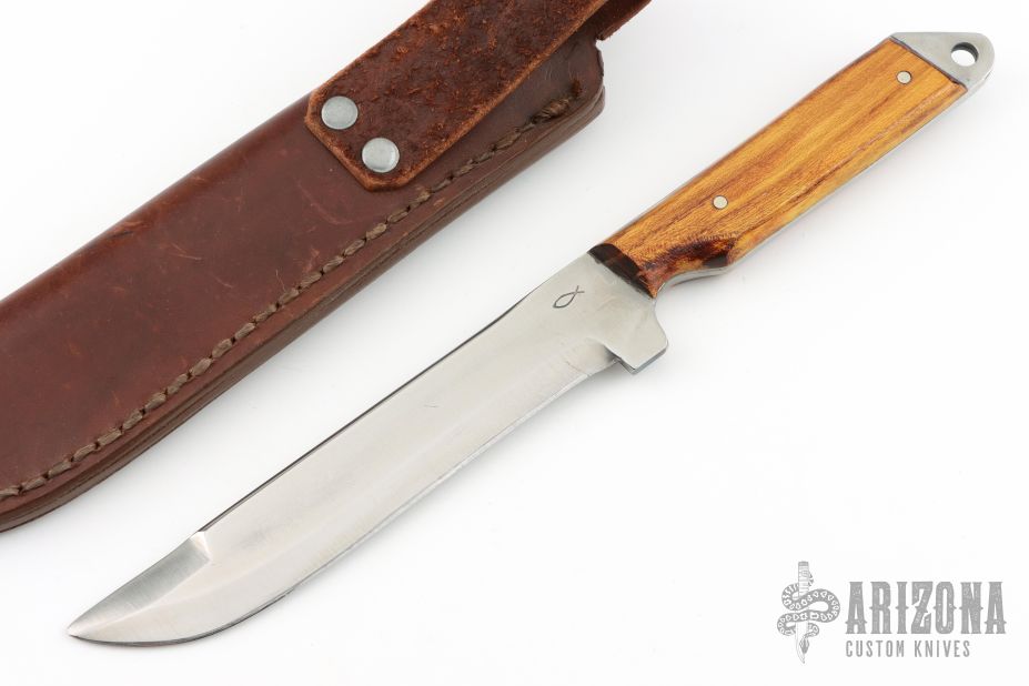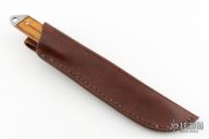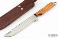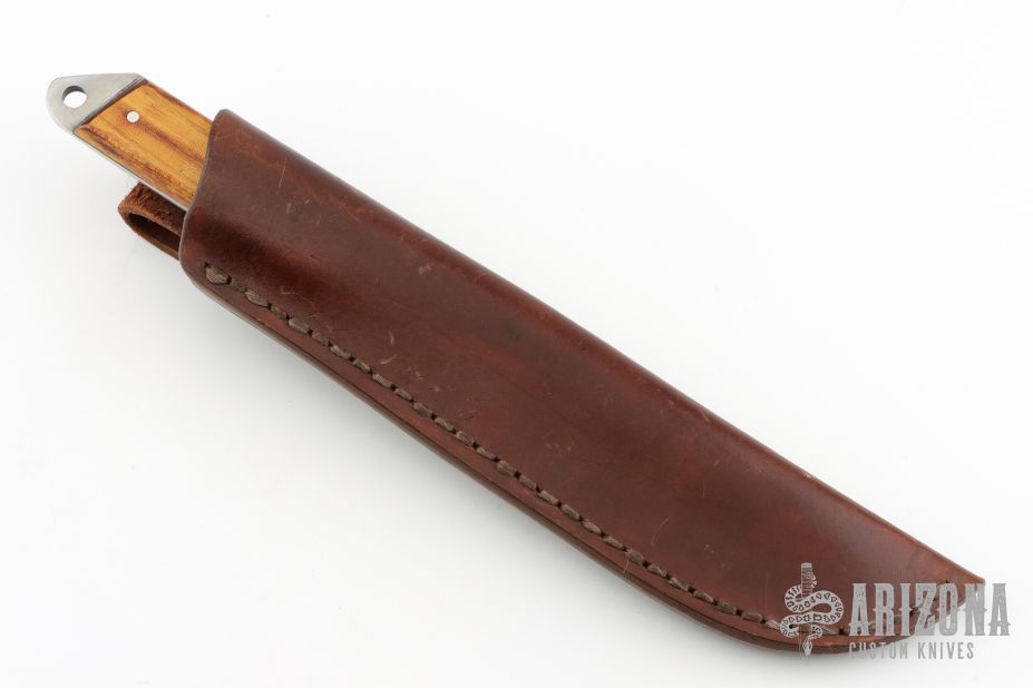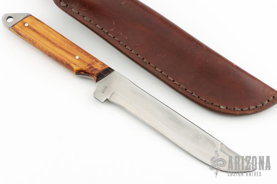This knife by HJ Girouard features a satin finished blade with sharpened top edge, .159" blade stock and 1.057" blade depth, full tang construction. The handle has wood scales with nickel silver pins. Comes with a brown leather sheath. Has a couple light scratches, otherwise excellent condition.