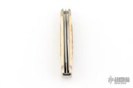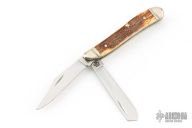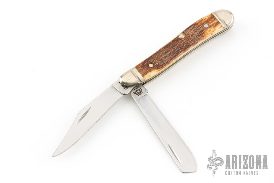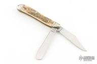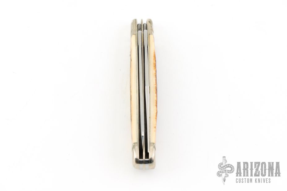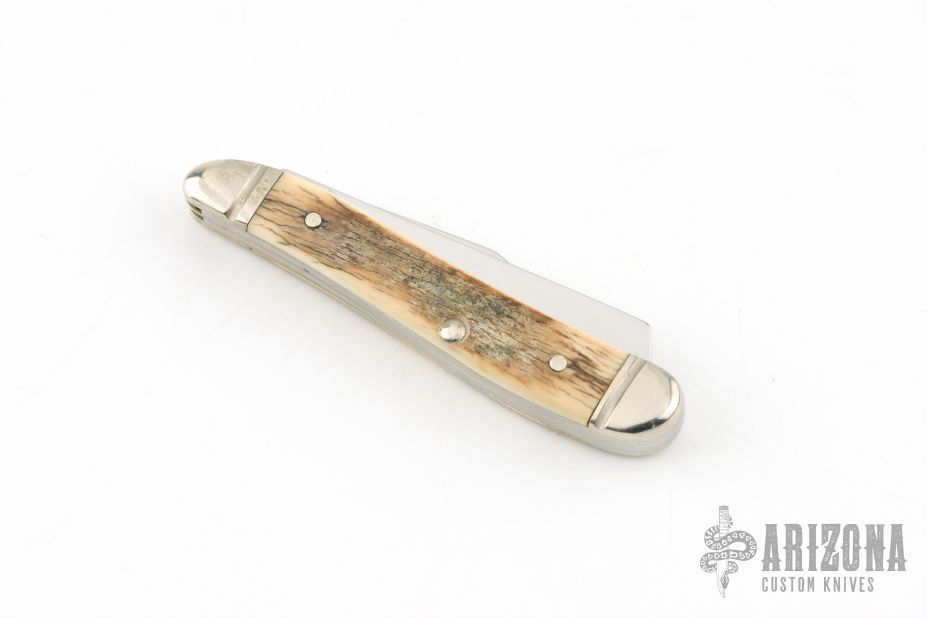 This Half Whittler by Case Knives features polished blades with nail nicks. The handle has nickel silver bolsters, front and rear, nickel silver liners, mammoth ivory covers, and stainless backspacers. Comes with original box and papers. Excellent condition.
