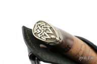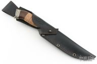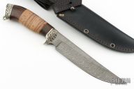This knife by Olamic Cutlery has a H.C.V.D. Damascus blade stamped #5528, .173" blade stock and 1.293" blade depth, hidden tang construction. The handle has a cast nickel silver guard and butt with lanyard hole, stacked birchbark grip with wenge wood spacers. Includes a black leather sheath with belt loop. Excellent condition.