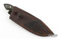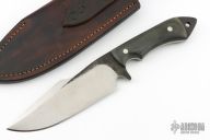 This knife by Ben Tendick features a clip point blade with swedge, .212" blade stock and 1.956" blade depth, with full tang construction. The handle has pinned micarta scales, and a lanyard hole in pommel. Comes with a leather belt sheath. Has some patina, some light scratches, and some scuffs. Excellent condition otherwise.