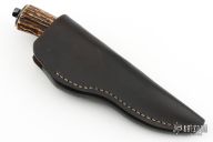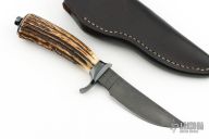 This knife by Jerry Rados features a Damascus blade with a distal taper, .166" blade stock and .962" blade depth, hidden tang construction. The handle has a blued steel guard and butt with a nice stag grip. Comes with a brown leather sheath. This knife is a full takedown design. Has some patina, excellent condition otherwise.