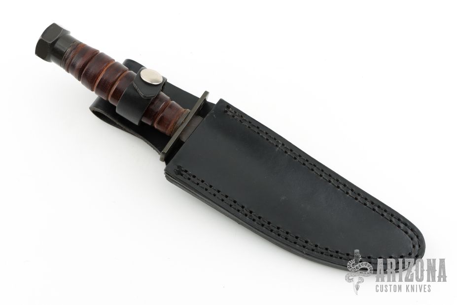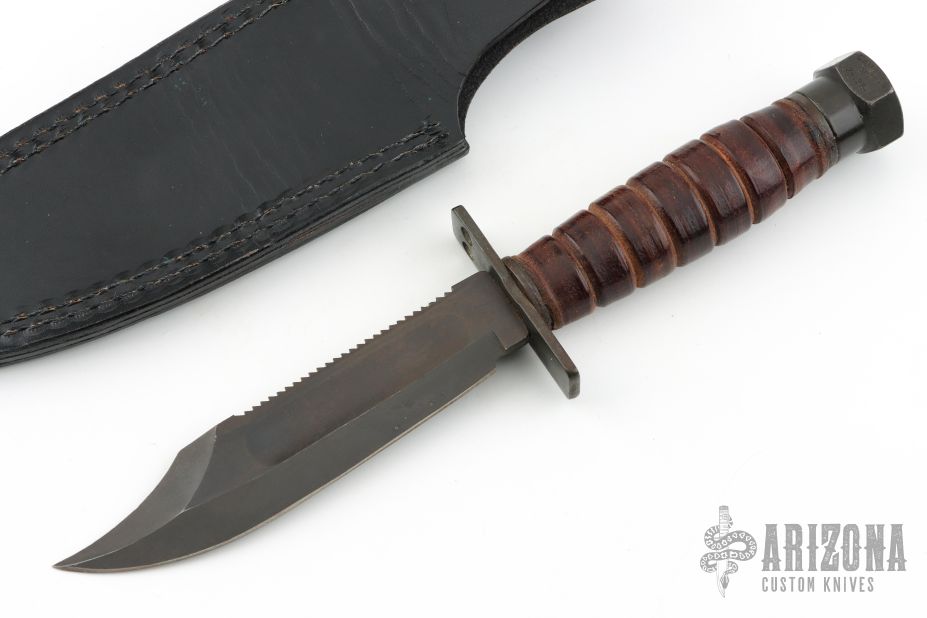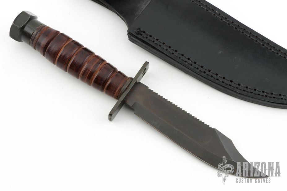 This knife from Camillus Knives is marked 2-1984 on the pommel. The blade has a sharpened top edge and sawteeth on blade spine, fullers, .185" blade stock and 1.126" blade depth, hidden tang construction. The handle has steel guard and pommel with stacked leather grip. Comes with black leather sheath. Has some scuffs, scratches, and patina. Great condition for its age.
