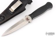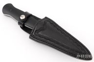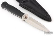 This Dagger by Burn Knives features a satin finished double edged blade with skulls on the ricasso, .241" blade stock and 1.194" blade depth, full tang construction with black G-10 scales. Comes with a hand tooled black leather sheath and a zippered case. Excellent condition. Comes with a COA dated 1-13-21. Excellent condition.