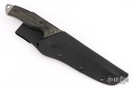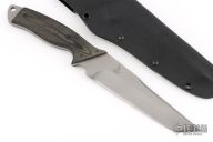This Nighthawk by Greg Lightfoot features a bead blasted chisel ground tanto blade with sharpened top edge, .191" blade thickness and 1.482" blade depth, full tang construction. The handle has black linen micarta scales and an extended tang with lanyard hole. Comes with a kydex sheath and a zippered case. Has a couple light scuffs, otherwise excellent condition.