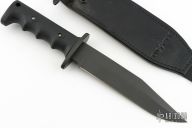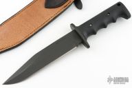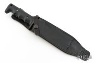 This knife features a black clip point blade with top edge, .220" blade stock and 1.377" blade depth, hidden tang construction. The handle has a black metal guard, and black FRN handle. Comes with original black leather sheath. Has some scuffs and scratches, excellent condition otherwise.