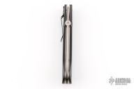 This linerlock features a hand rub satin finished blade with thumbdisc. The handle has black G-10 scales, titanium liners, black linen micarta backspacer, tip down stainless steel clip. Nice detent, lockup and blade seating. Has a couple light scratches, otherwise excellent condition. Comes with a zippered case.
