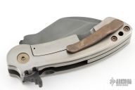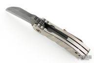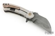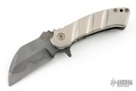 This knife by Grindhouse Knives features a .340" wharncliffe blade with hamon, notched thumbrest and flipper. The handle has a satin finished .280" titanium frame with floating titanium backspacer, "unobtanium" tip up clip, and lanyard hole at the butt. Comes with a zippered case. Nice detent, lockup and blade seating. Excellent condition.