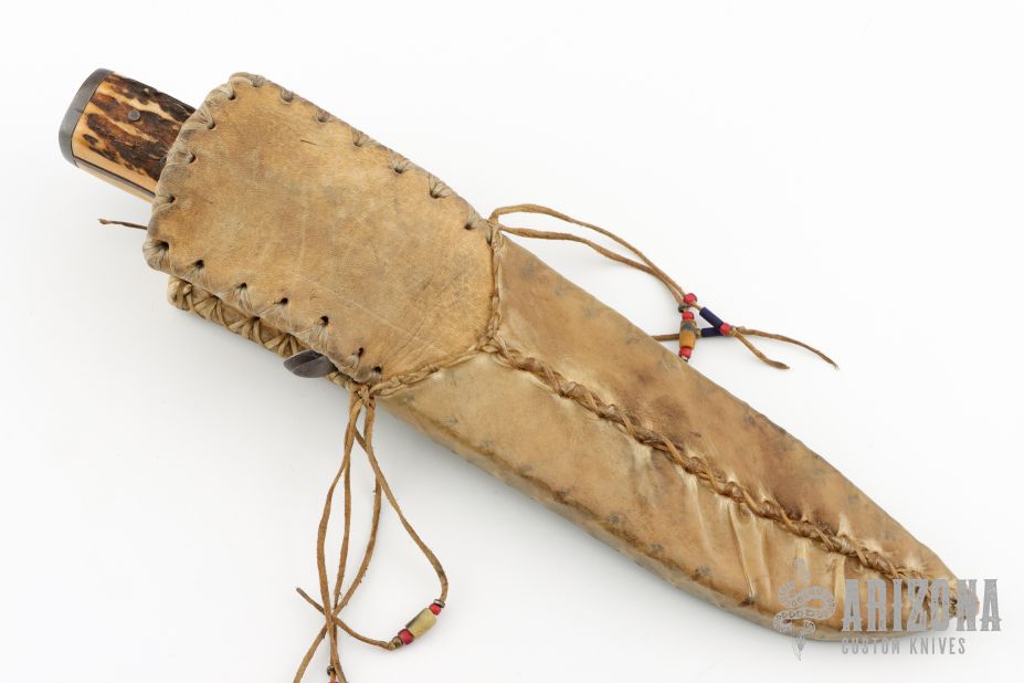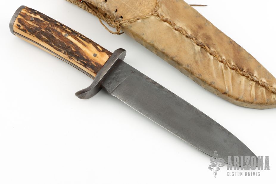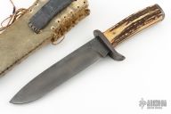 This Small Bowie by Master Smith Daniel Winkler features a heat colored clip point file blade and a framed tang. .184" Blade Stock.  1.367" Blade Depth. The handle features steel guard and butt complimented by pinned stag scales.  Includes a leather and rawhide sheath. Has some light oxidation and patina, great condition otherwise.
