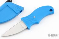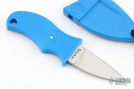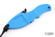 This Buddy System by Blackie Collins is a neck knife with mirror polished blade and ivory plastic handle. Comes with locking neck sheath. Excellent condition.