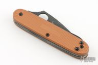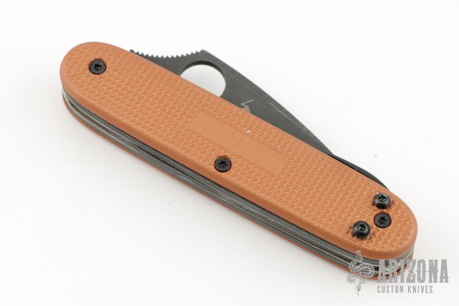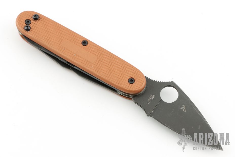 This Victorinox has been modified and has a Spyderco blade. It features acid tumble finished tools, and an orange handle. Four tools total. Has some scuffs, otherwise excellent condition.